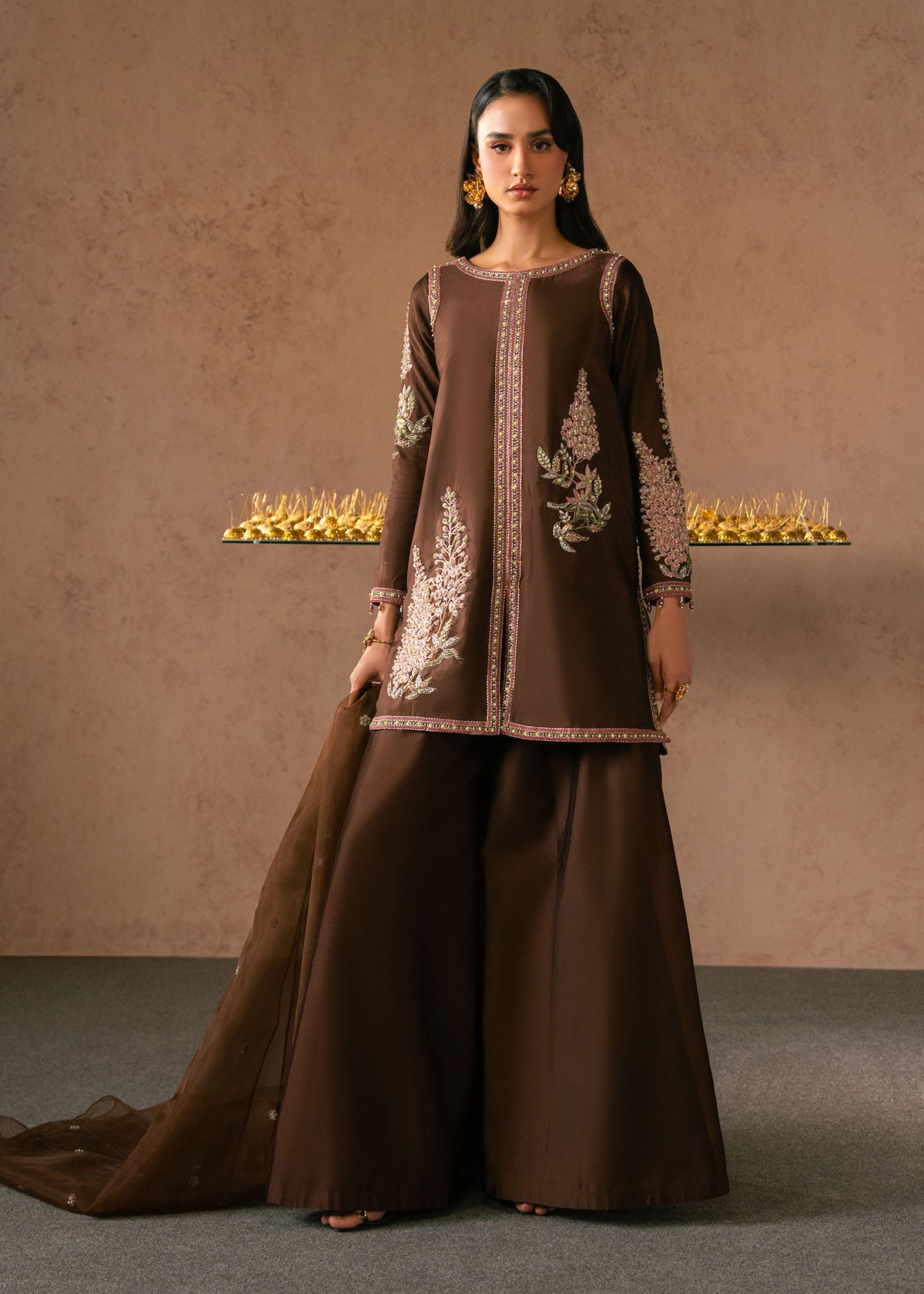 - A sheer organza dupatta in matching brown completes the ensemble, lightly embellished and draped effortlessly over the shoulders for an ethereal touch.