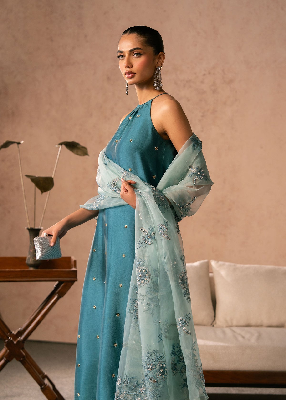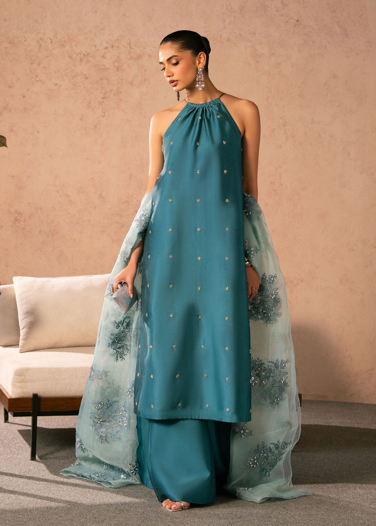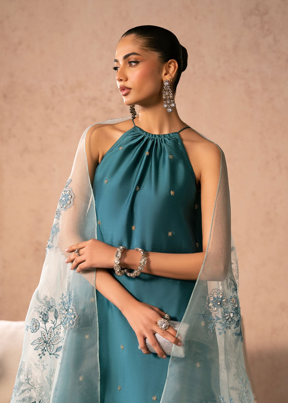 - Completing the ensemble is a sheer, mint-toned organza dupatta adorned with intricate floral embroidery and fine detailing along the borders. Light and airy, it adds contrast and softness to the deeper teal base, elevating the overall look.