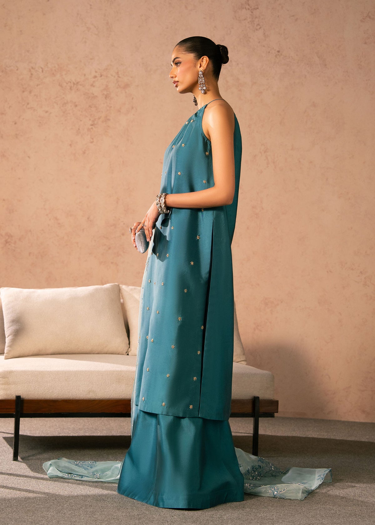 - This outfit is a modern yet graceful traditional ensemble in a rich teal hue, blending minimalism with delicate detailing.