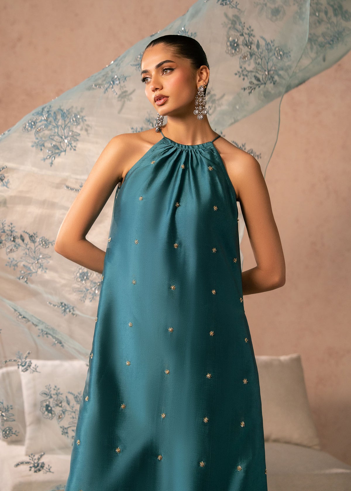 - The look features a sleeveless, halter-neck kurta with a soft gathered neckline that creates a fluid, elegant drape. The silhouette is straight and relaxed, offering effortless sophistication. Subtle gold embellishments are scattered delicately across the fabric, adding understated sparkle without overpowering the design.