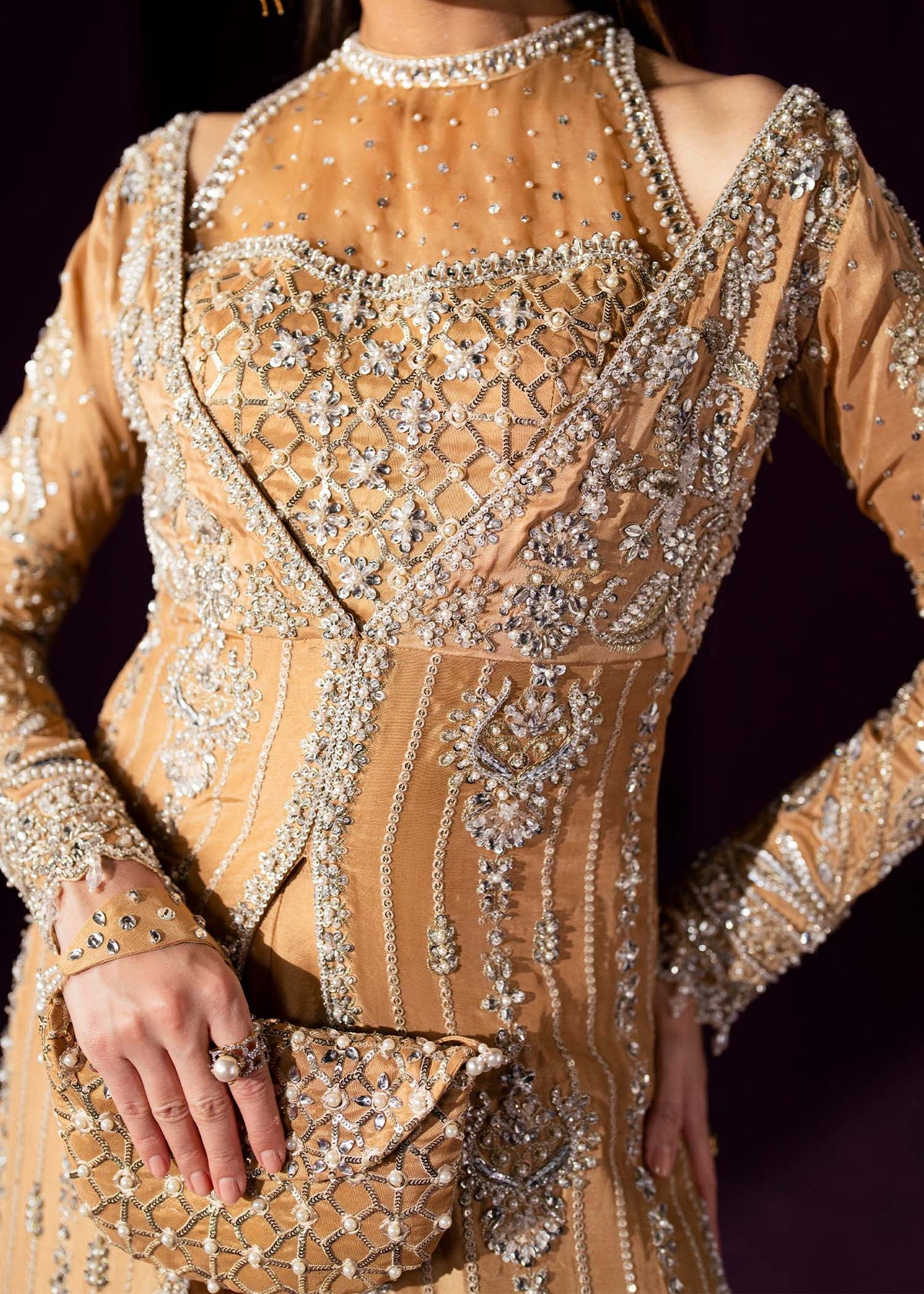 Description: Introducing Oriana,A Nude front-open A-line gown with a sheer halter bodice, paired effortlessly with flowing palazzo pants all crafted in pure silk. Adorned in a constellation of crystals, Swarovski stones, pearls, and sequins. A silhouette that moves like poetry and sparkles like stardust!