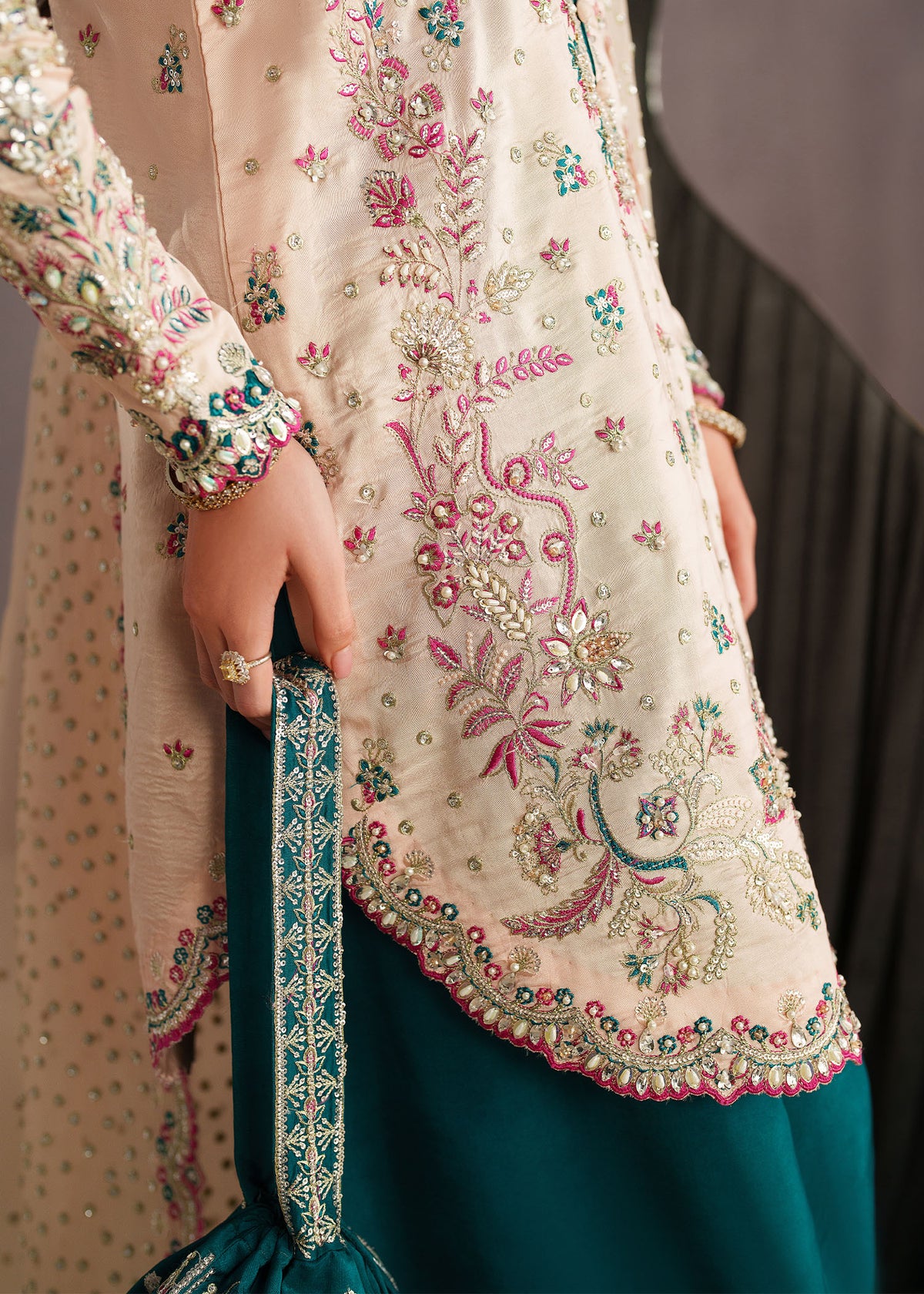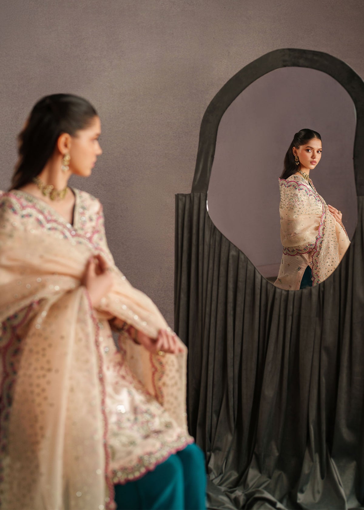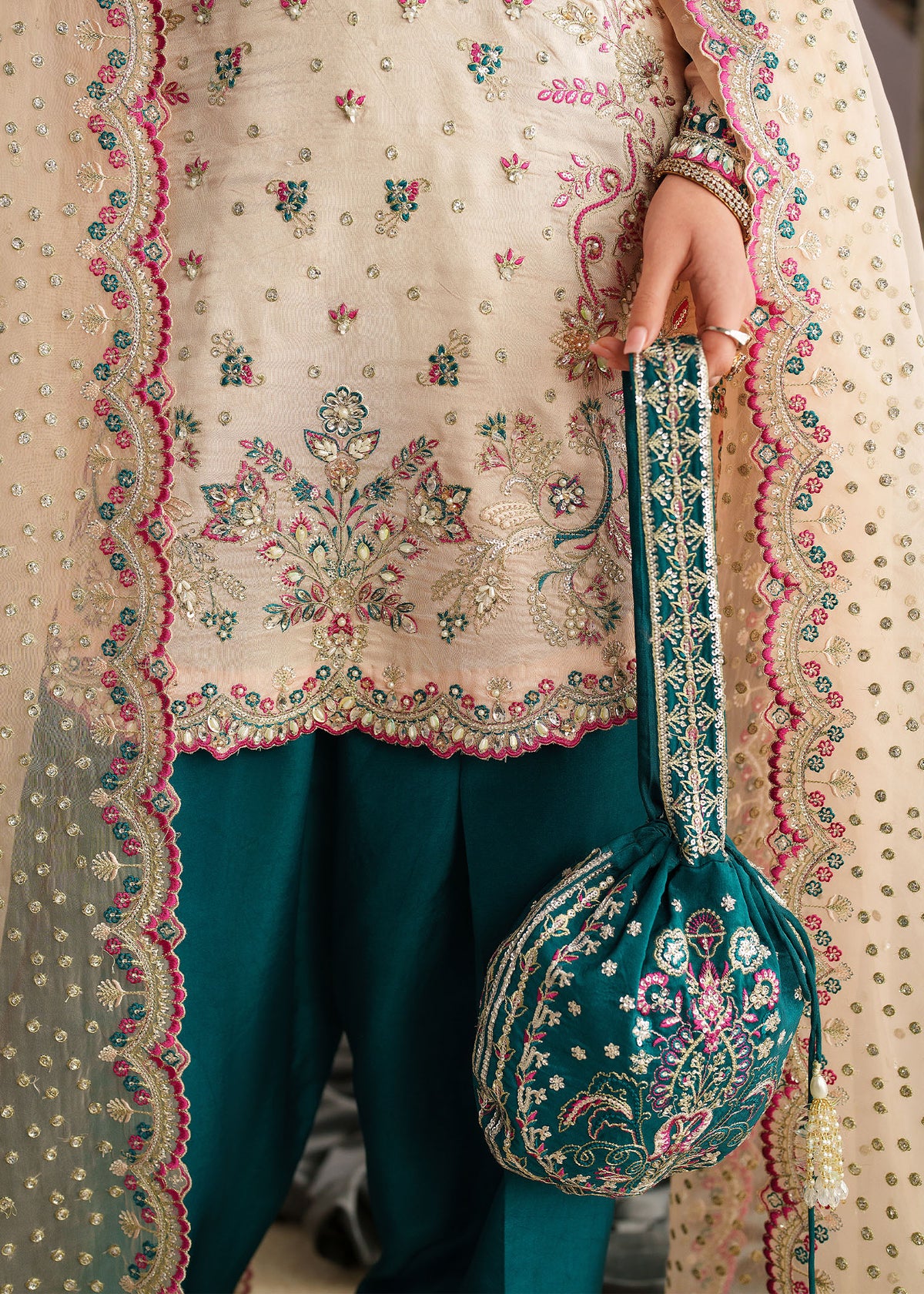 An elegant three-piece traditional outfit featuring a soft ivory embroidered kameez adorned with delicate floral motifs and intricate detailing along the neckline and hem. The kameez is paired with rich teal straight-cut trousers that add a striking contrast to the subtle base tone. Completing the look is a sheer ivory dupatta, beautifully finished with scalloped embroidered borders and scattered embellishments for a graceful drape. The ensemble is styled with minimal gold jewelry and a matching teal potli bag, creating a refined and timeless look perfect for festive Eid occasions or formal gatherings.