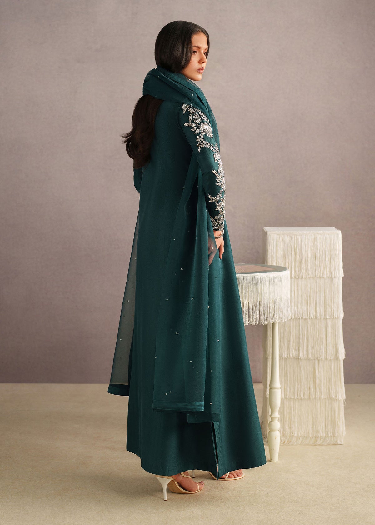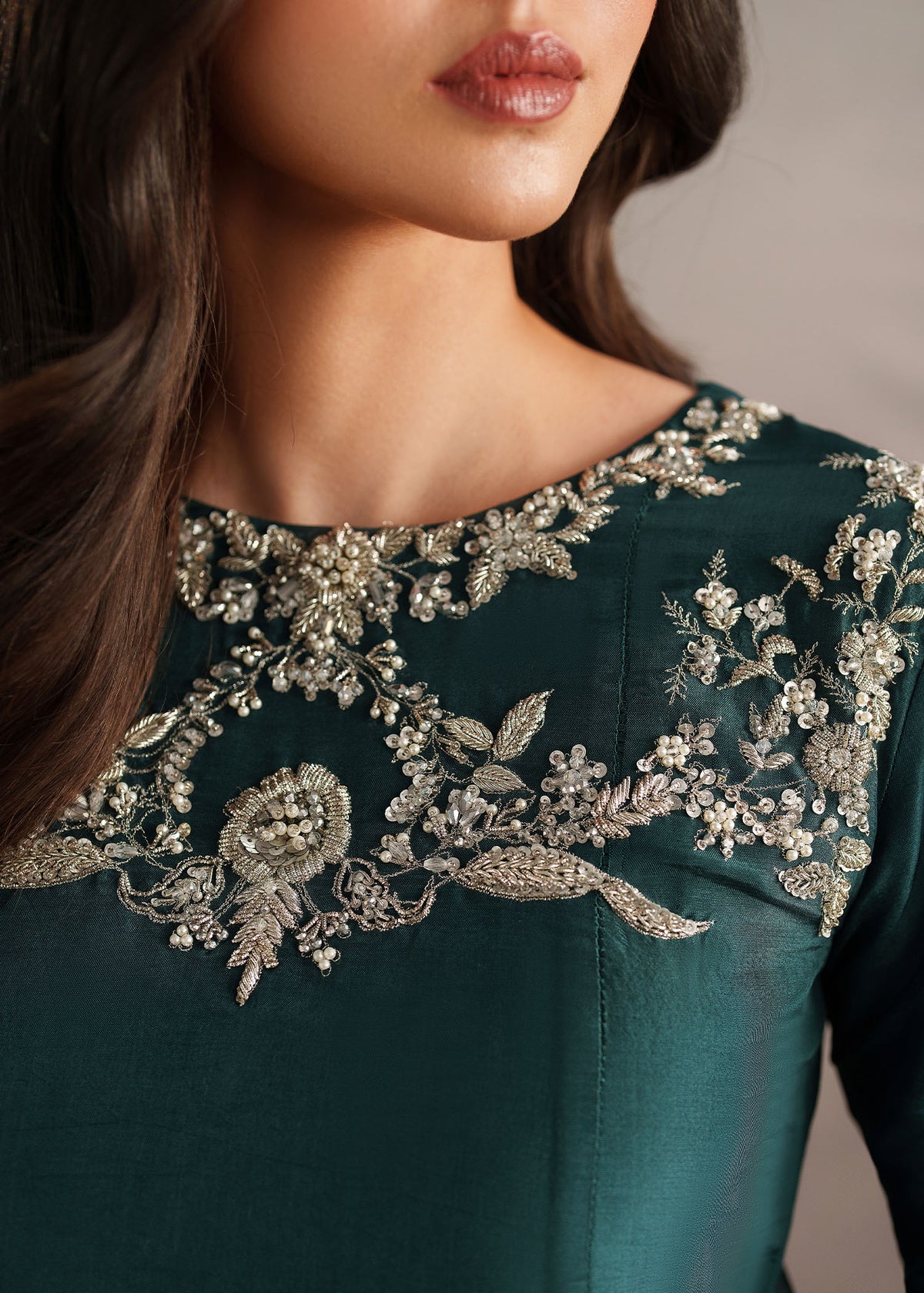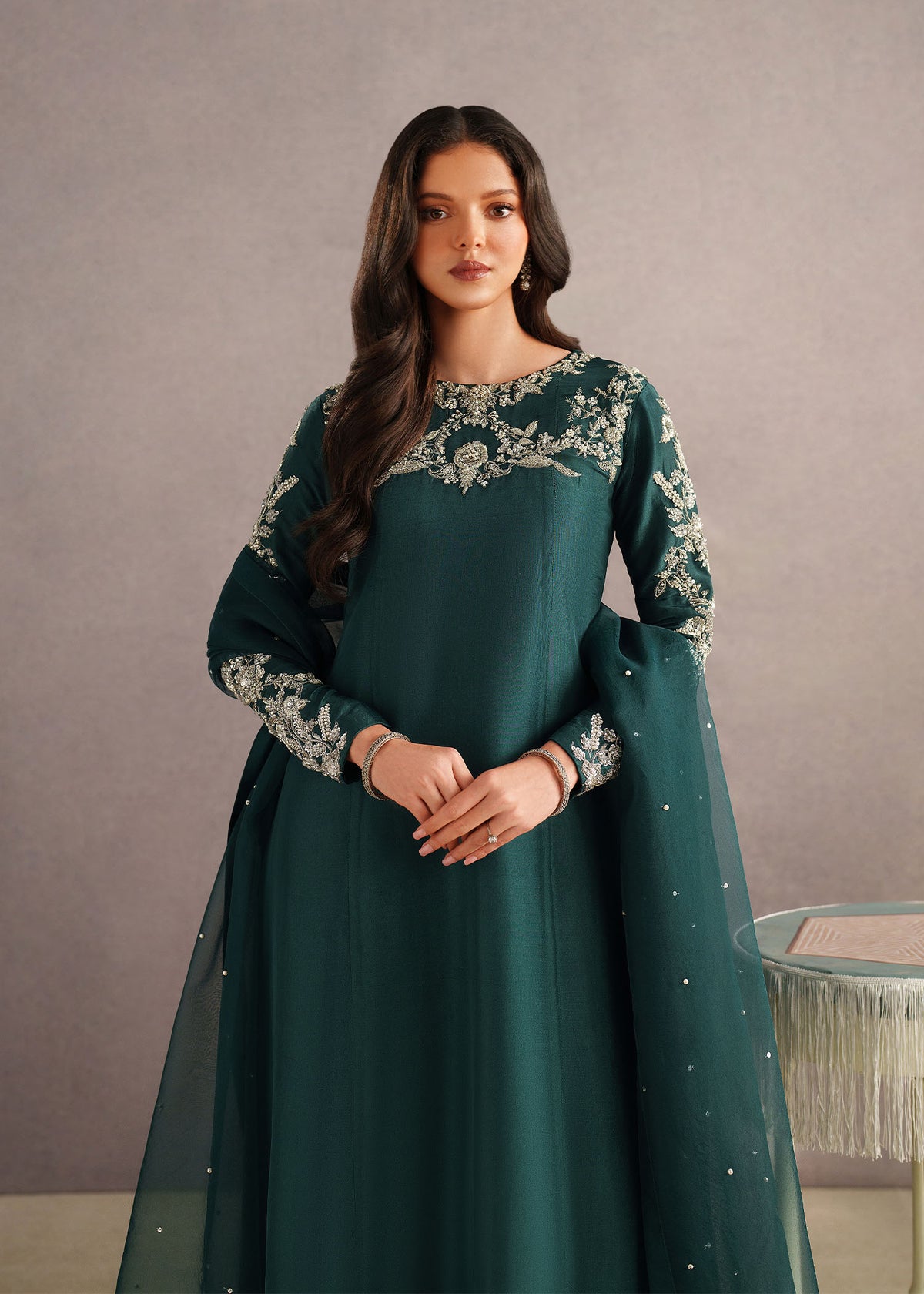 Elevate your evening look with this elegant deep teal long dress, designed for timeless sophistication. Crafted from a flowy, lightweight fabric, the outfit features intricate silver embroidery on the neckline and sleeves, adding a luxurious and refined touch. The straight-cut silhouette offers a graceful fall, ensuring comfort and effortless style.