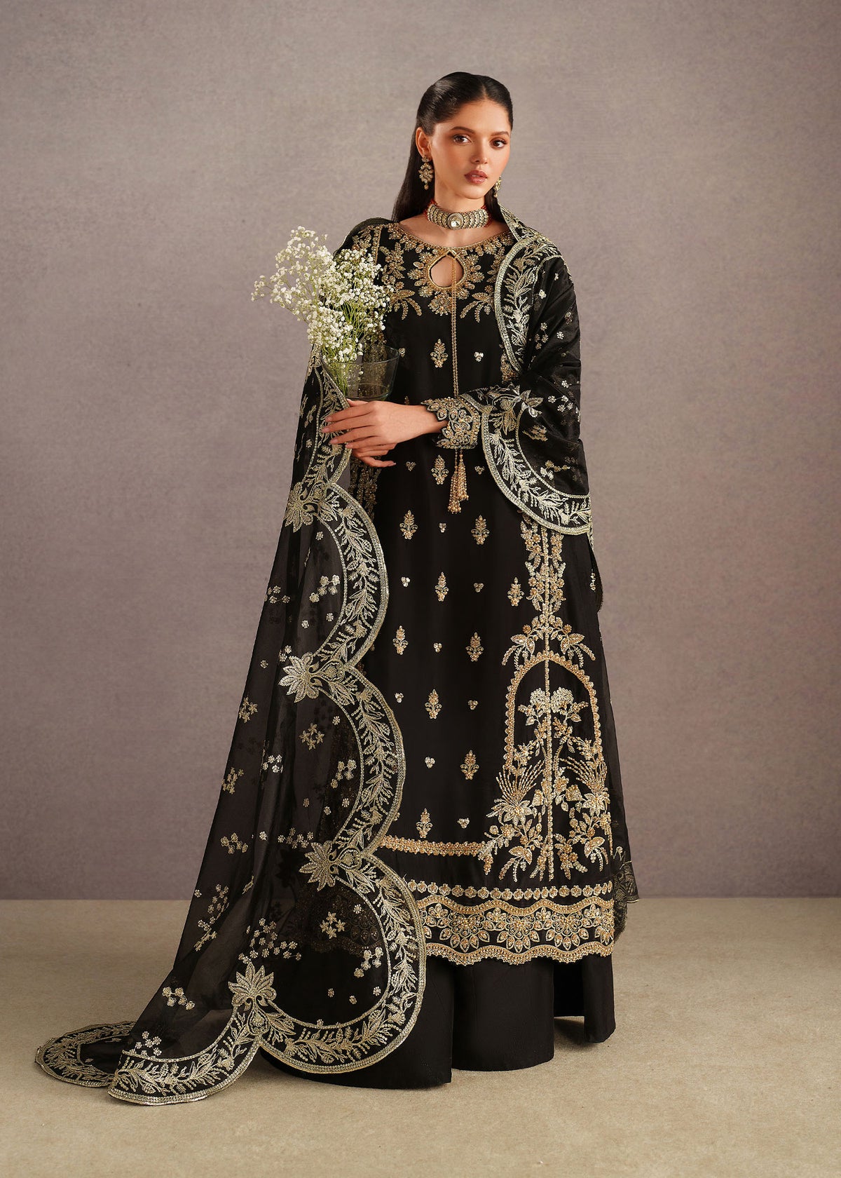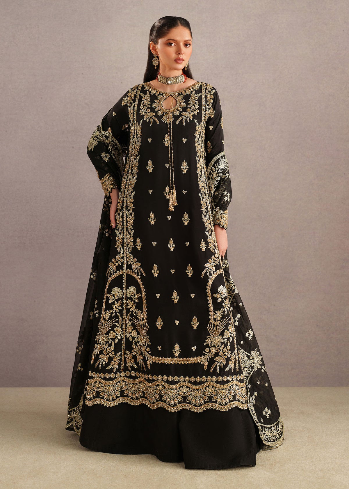 A timeless black traditional ensemble adorned with intricate antique gold embroidery, exuding regal elegance. The outfit features a beautifully detailed long kameez with delicate floral and paisley motifs scattered across the fabric, complemented by an ornate embroidered hem. The neckline is enhanced with fine embellishment and a subtle keyhole detail, adding a touch of sophistication.