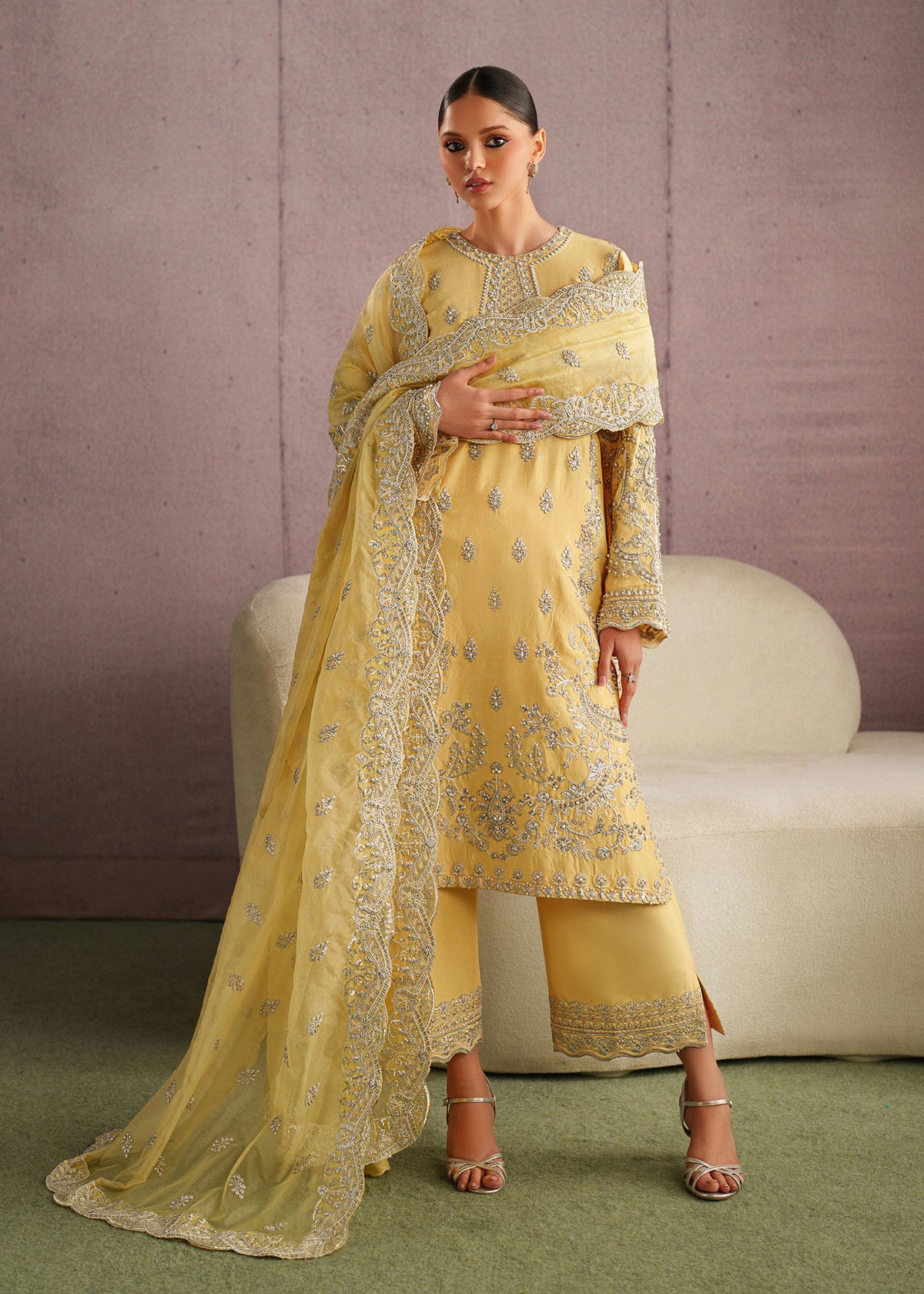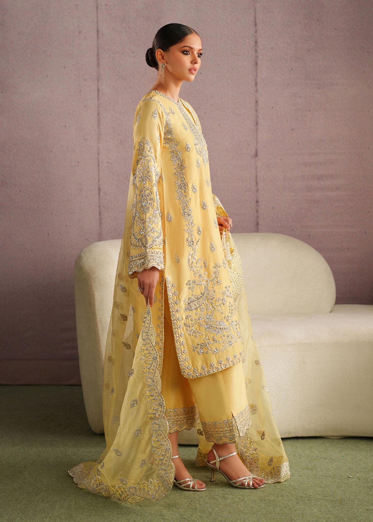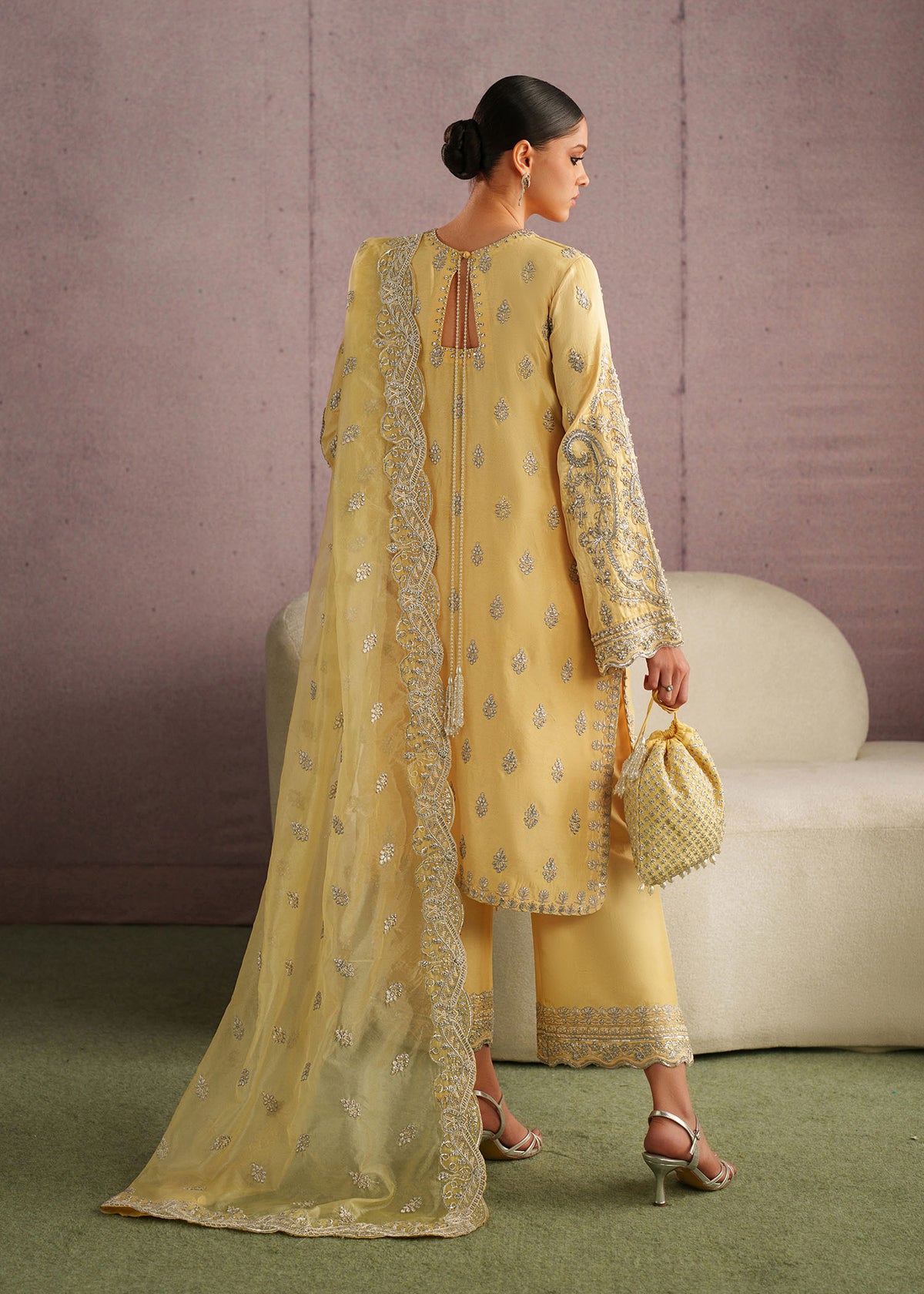 A refined three-piece traditional ensemble in a soft pastel yellow hue, featuring a straight-cut kurta adorned with intricate silver embroidery. The kurta showcases detailed embellishment along the neckline, front panel, sleeves, and hem, with delicate motifs scattered across the fabric for a balanced, luxurious look. It is paired with matching wide-leg trousers finished with embroidered borders at the hem, adding a modern yet graceful touch. The look is completed with a coordinated dupatta featuring ornate embroidered edges and subtle detailing throughout. Styled with minimal jewelry, metallic heels, and a matching embellished potli bag, this outfit exudes understated elegance—perfect for festive occasions, formal gatherings, or daytime celebrations.