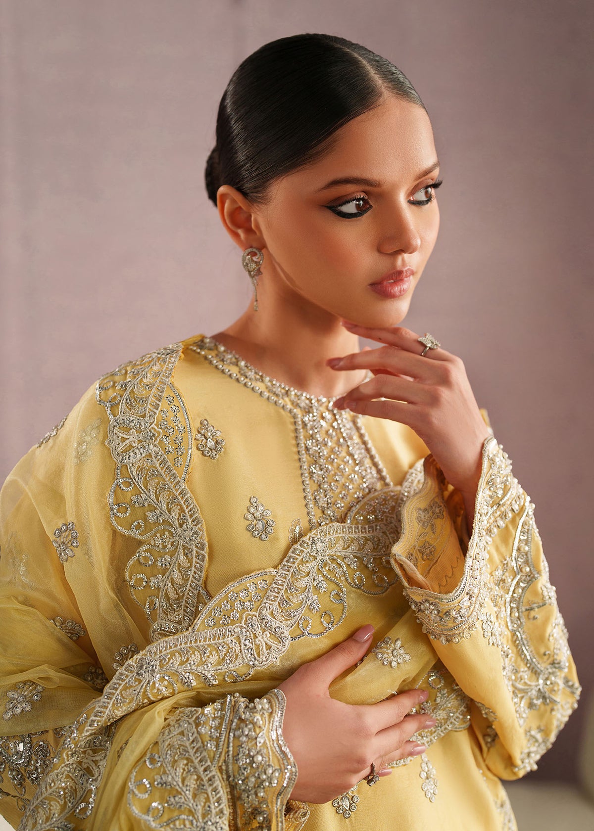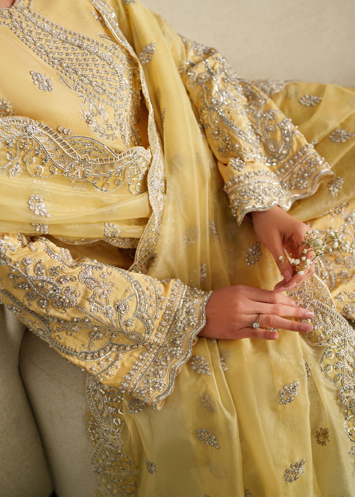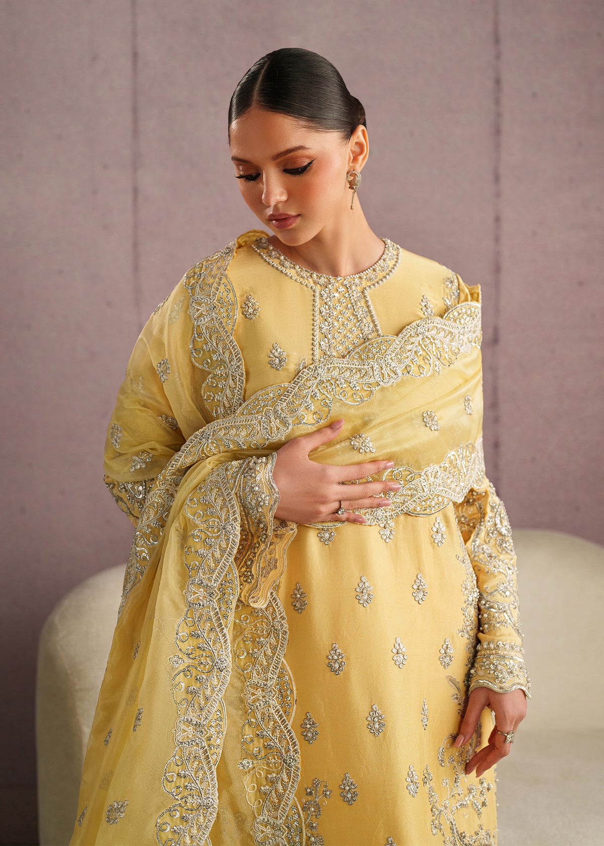 A refined three-piece traditional ensemble in a soft pastel yellow hue, featuring a straight-cut kurta adorned with intricate silver embroidery. The kurta showcases detailed embellishment along the neckline, front panel, sleeves, and hem, with delicate motifs scattered across the fabric for a balanced, luxurious look. It is paired with matching wide-leg trousers finished with embroidered borders at the hem, adding a modern yet graceful touch. The look is completed with a coordinated dupatta featuring ornate embroidered edges and subtle detailing throughout. Styled with minimal jewelry, metallic heels, and a matching embellished potli bag, this outfit exudes understated elegance—perfect for festive occasions, formal gatherings, or daytime celebrations.