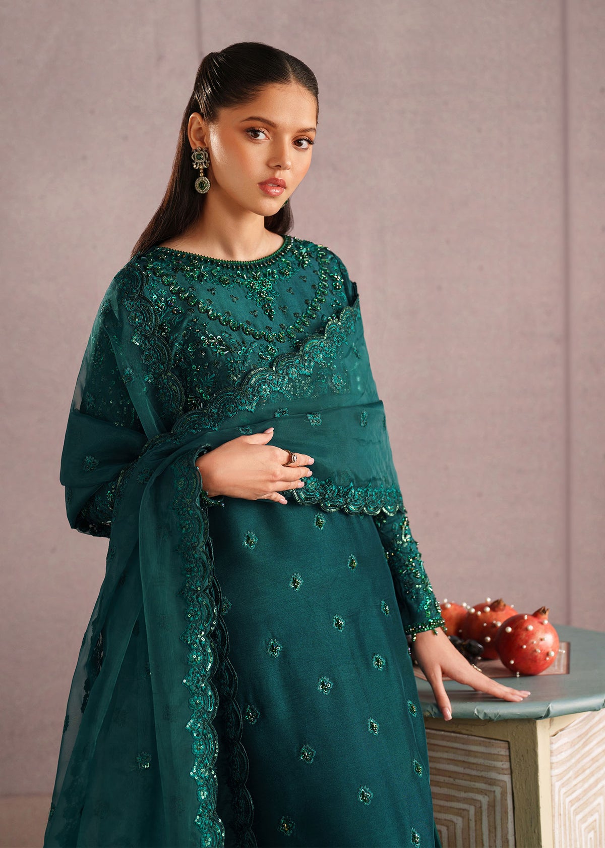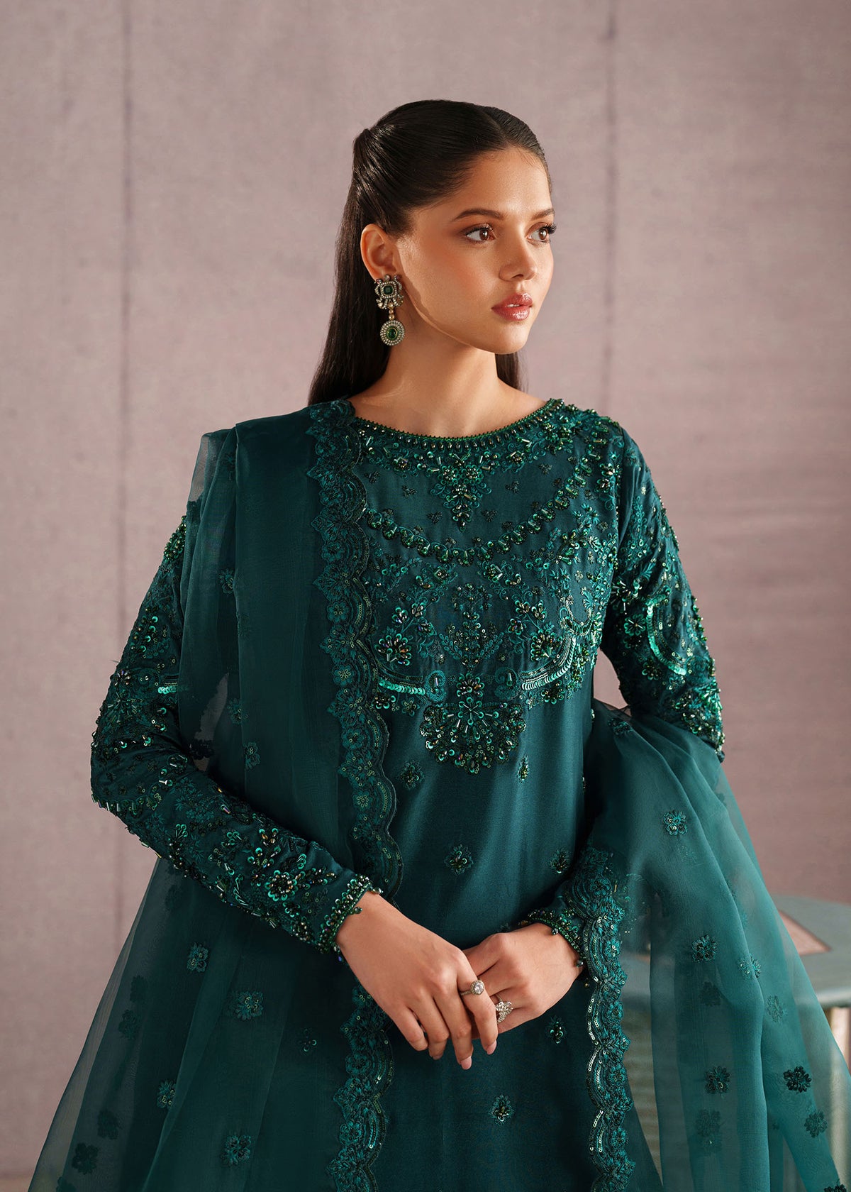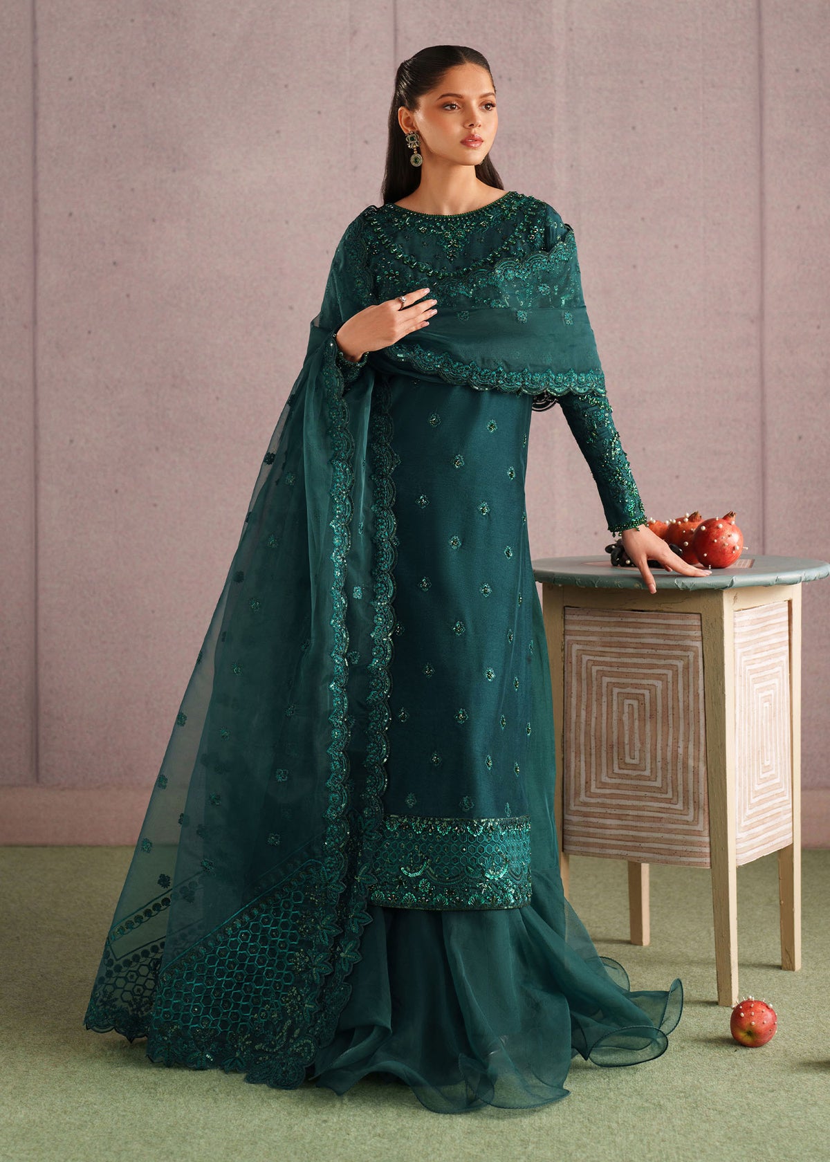 An elegant deep emerald green ensemble crafted in sheer, flowy fabric, adorned with intricate tonal embroidery and delicate embellishments throughout. The straight-cut long kurta features detailed handwork along the neckline, sleeves, and hem, creating a refined and graceful silhouette. It is paired with a matching flared sharara-style bottom that adds volume and movement. The look is completed with a sheer embroidered dupatta, finished with ornate borders that enhance its luxurious appeal. Perfect for festive occasions, weddings, and formal evenings, this outfit exudes timeless sophistication and regal charm.