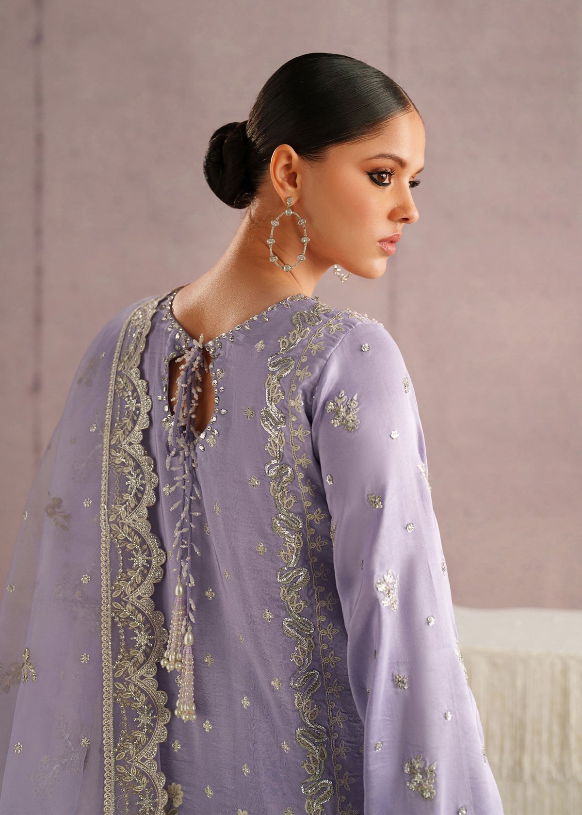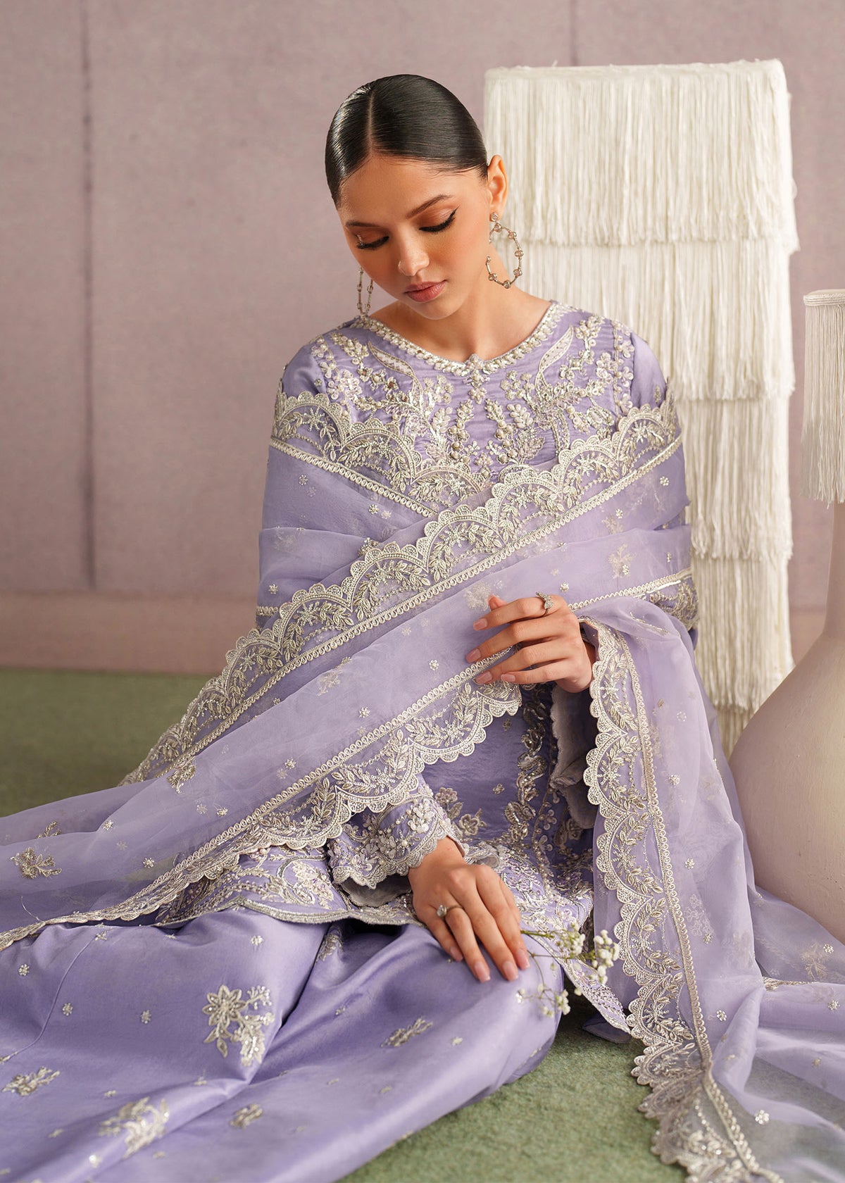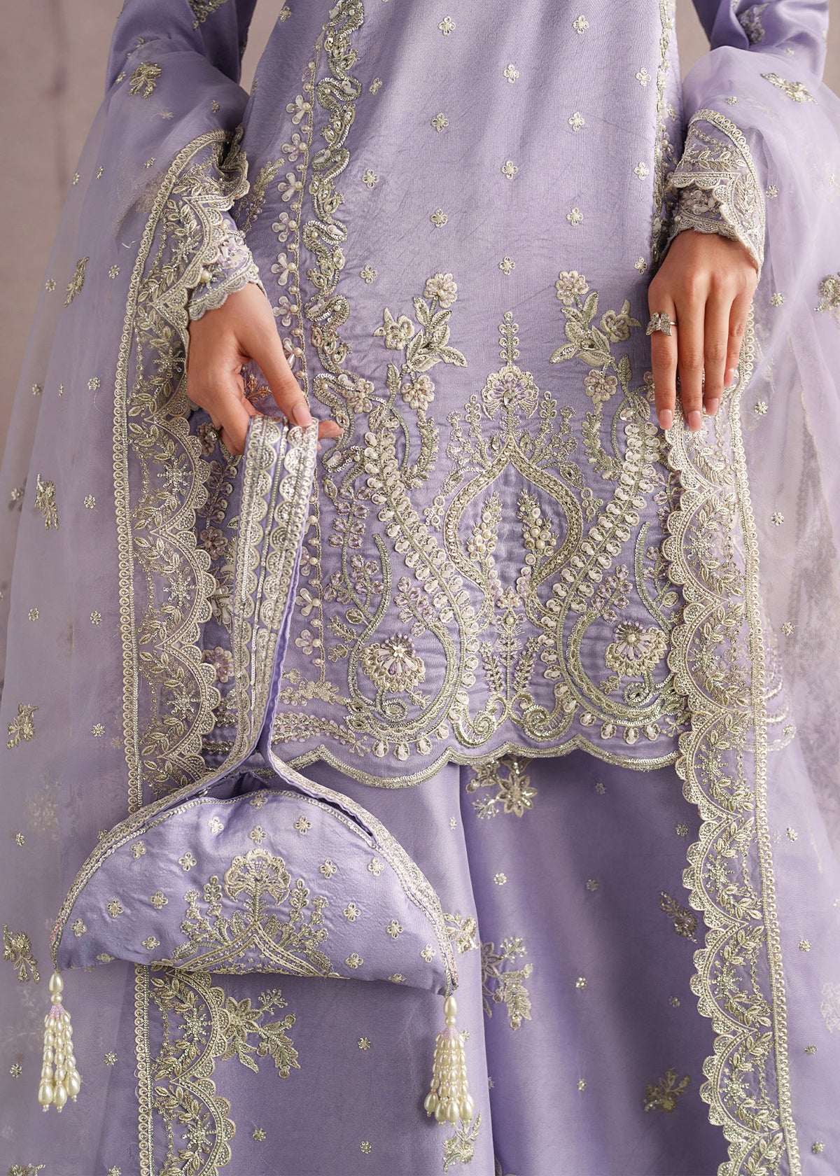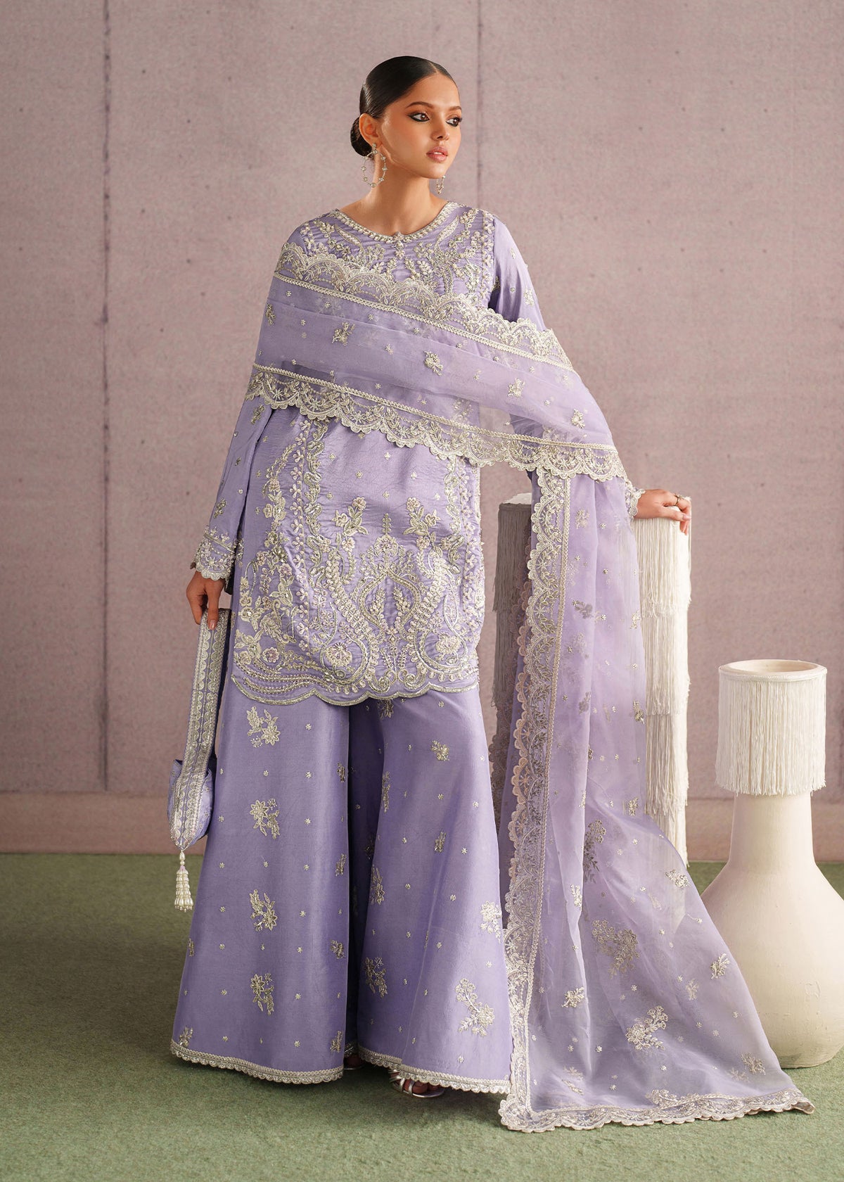 A graceful lavender three-piece ethnic ensemble featuring a heavily embroidered short kurta, wide palazzo pants, and a sheer dupatta. The kurta is adorned with intricate silver and ivory threadwork, showcasing floral and paisley motifs concentrated around the neckline, hem, and sleeves. The scalloped hemline and fine detailing add a luxurious finish.