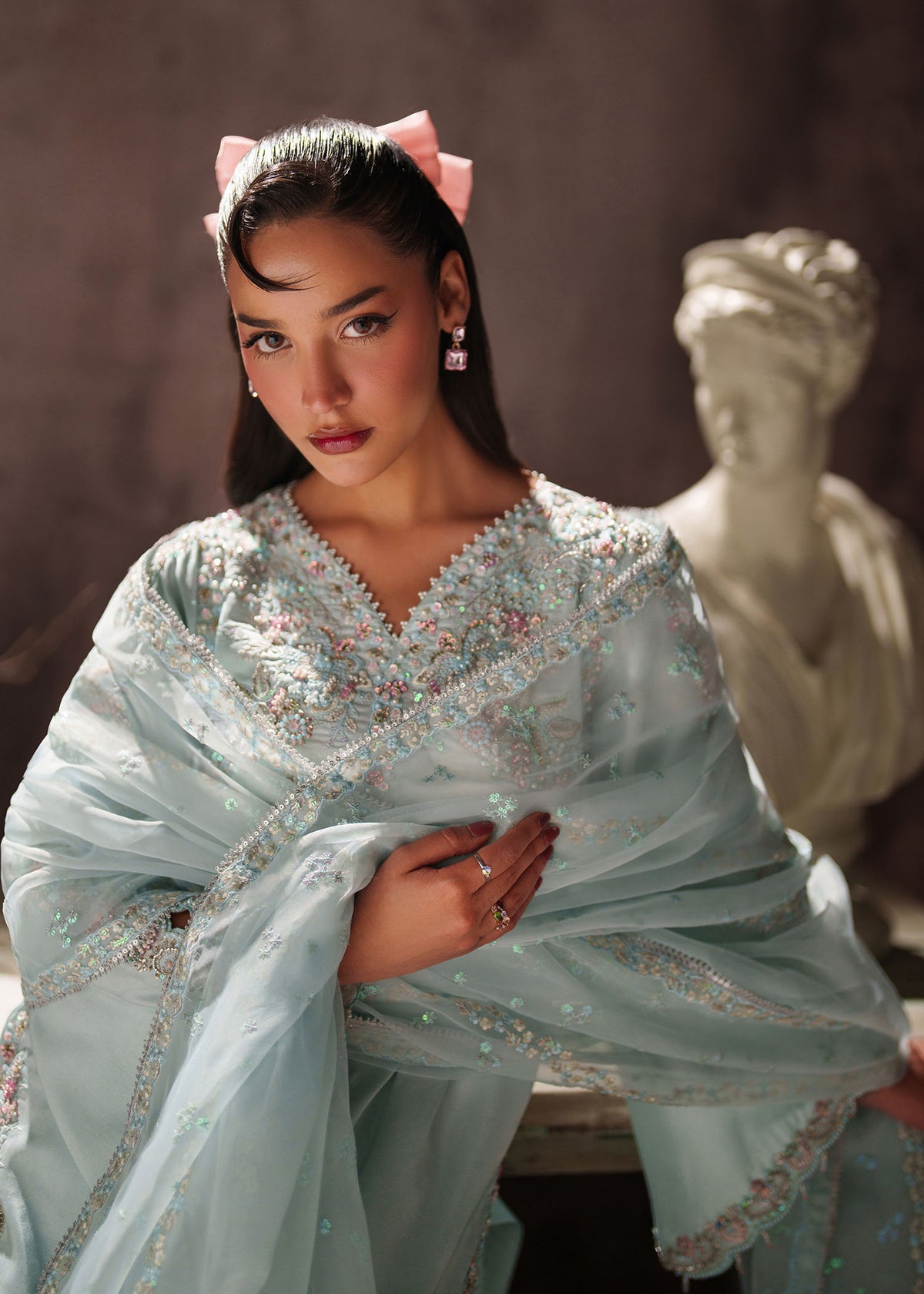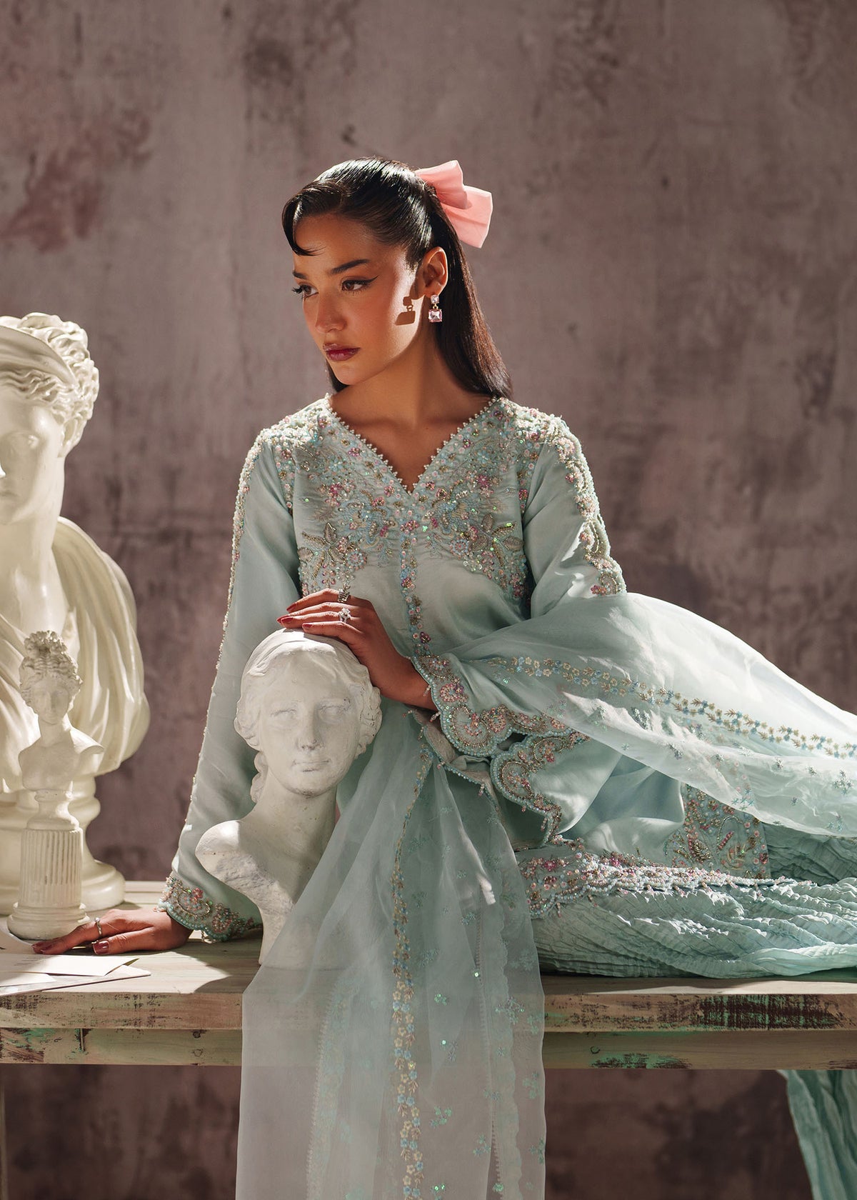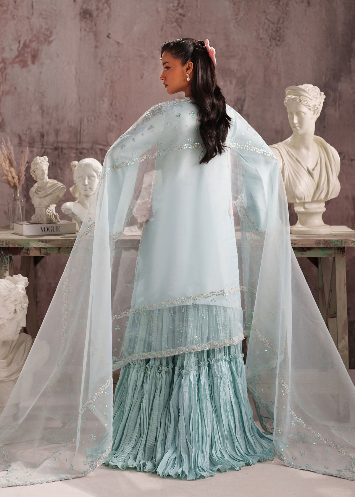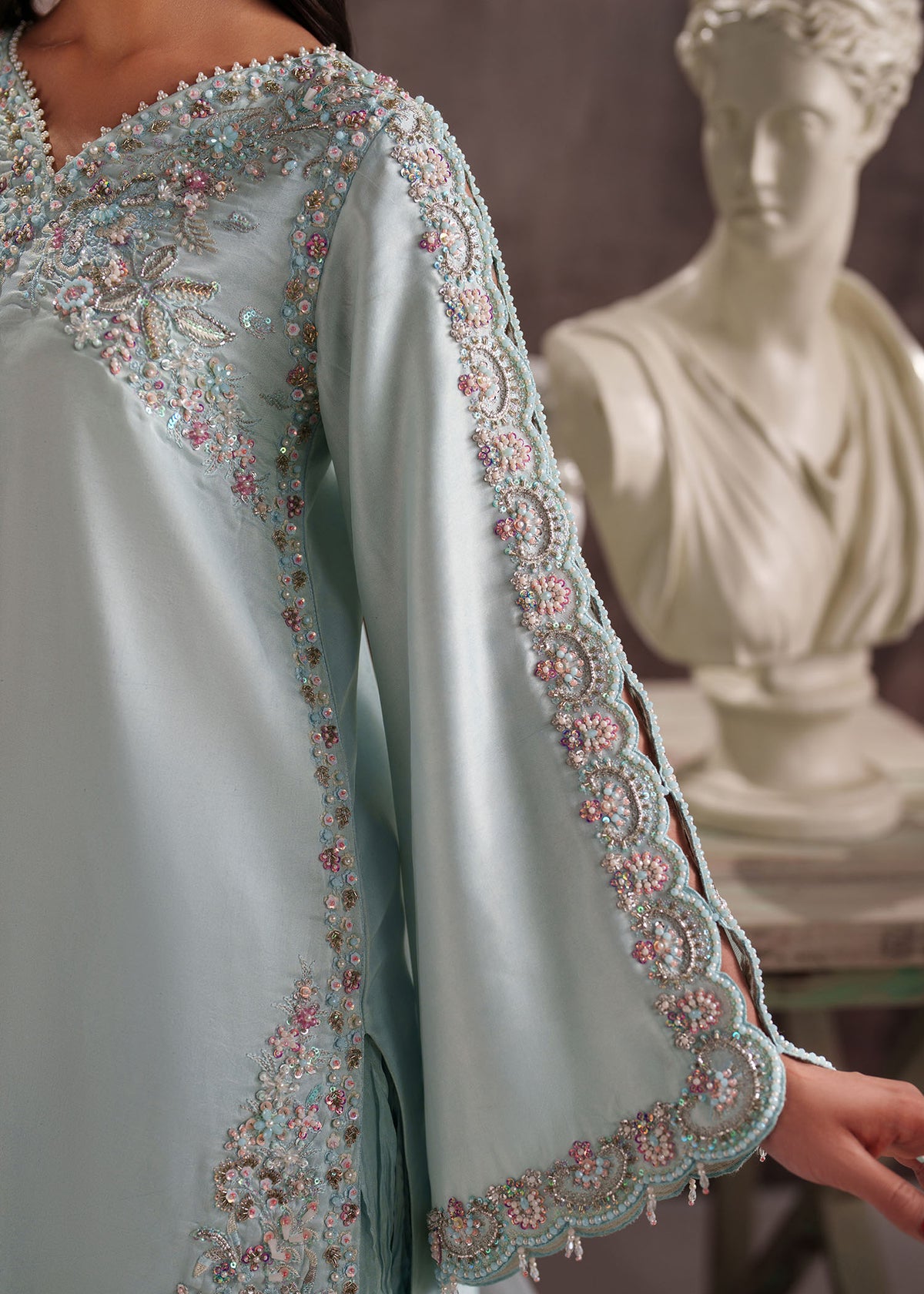 Crafted on a serene blue base, this outfit is designed in luxurious tissue silk and elevated with delicate embroidery, soft embellishments, and subtle pearl detailing. Gentle hints of pink add a refined warmth, creating an effortless harmony that feels elegant without trying too hard. Timeless, graceful, and memorable, this piece is made to solve that “nothing to wear” moment and is a personal favorite of the designer.