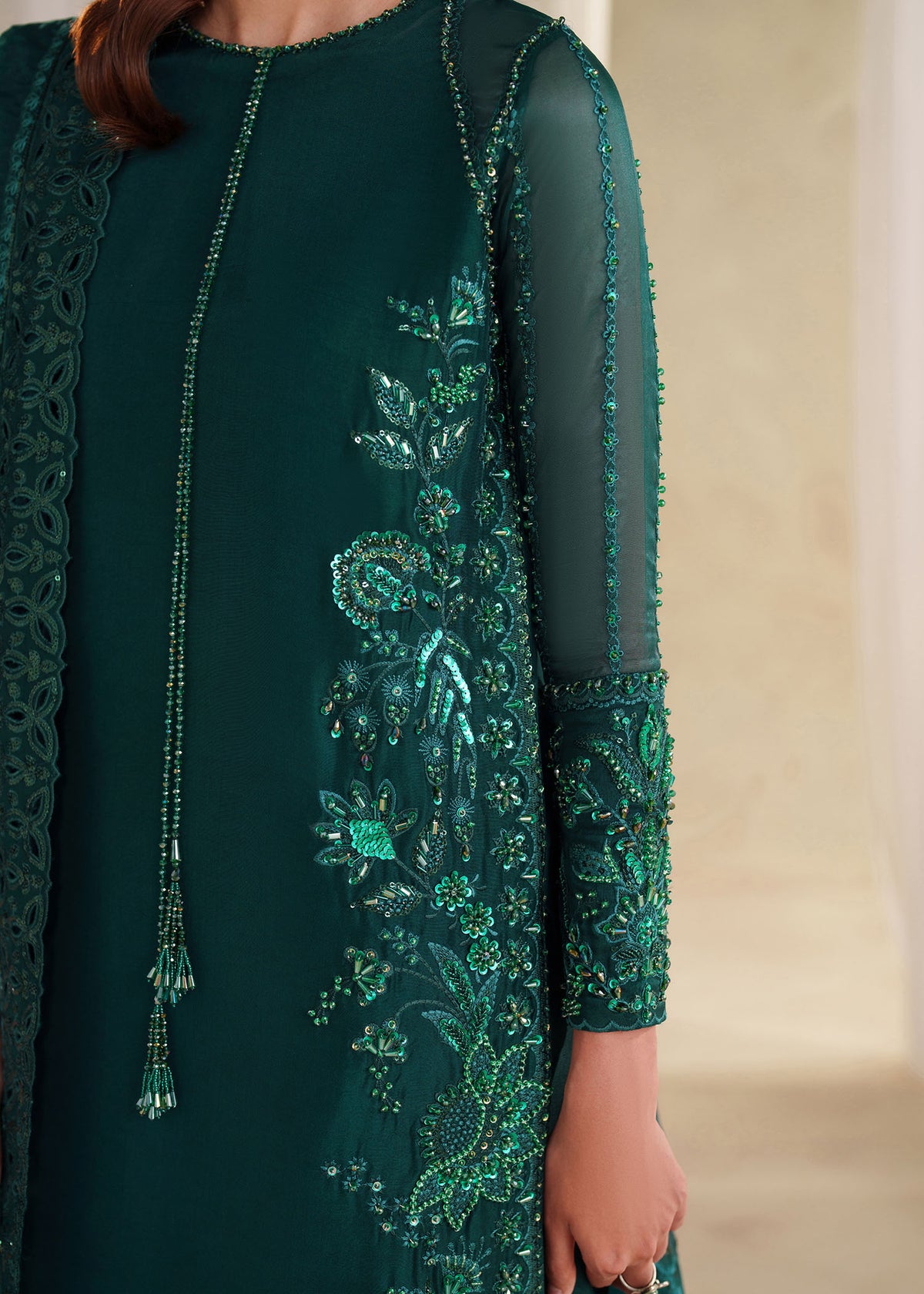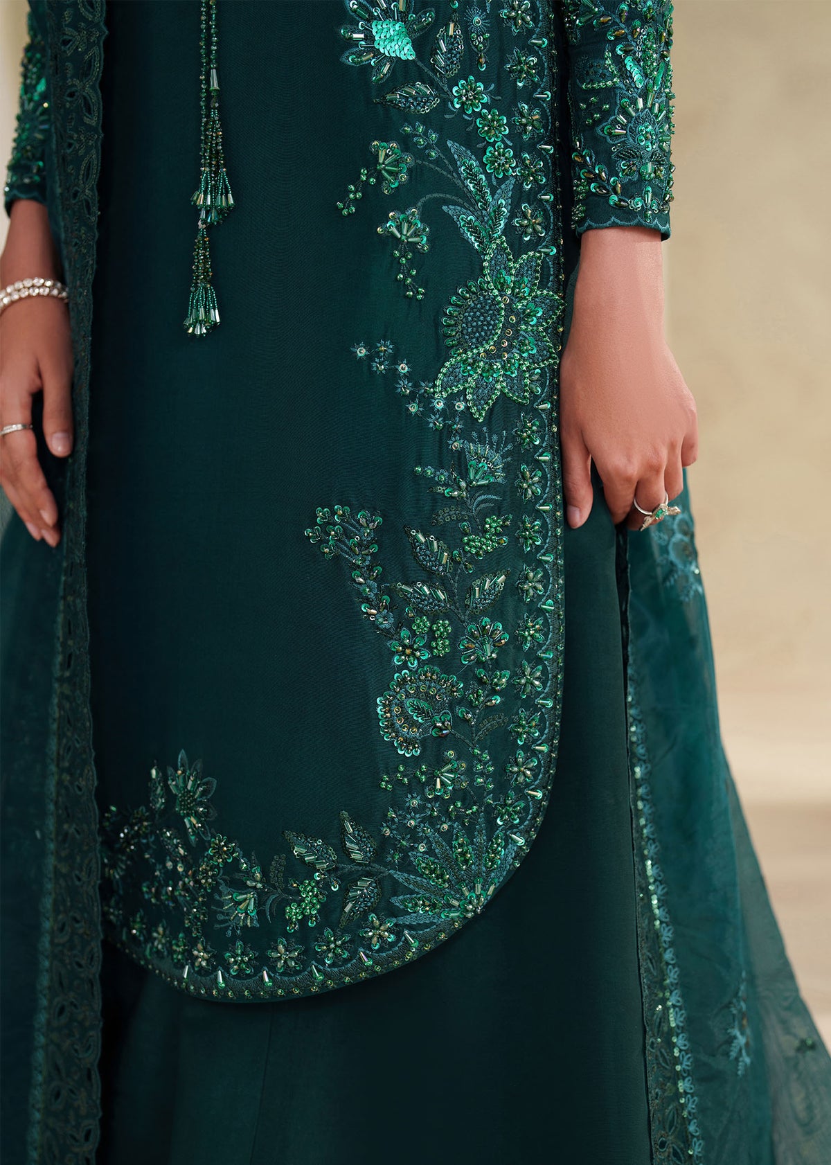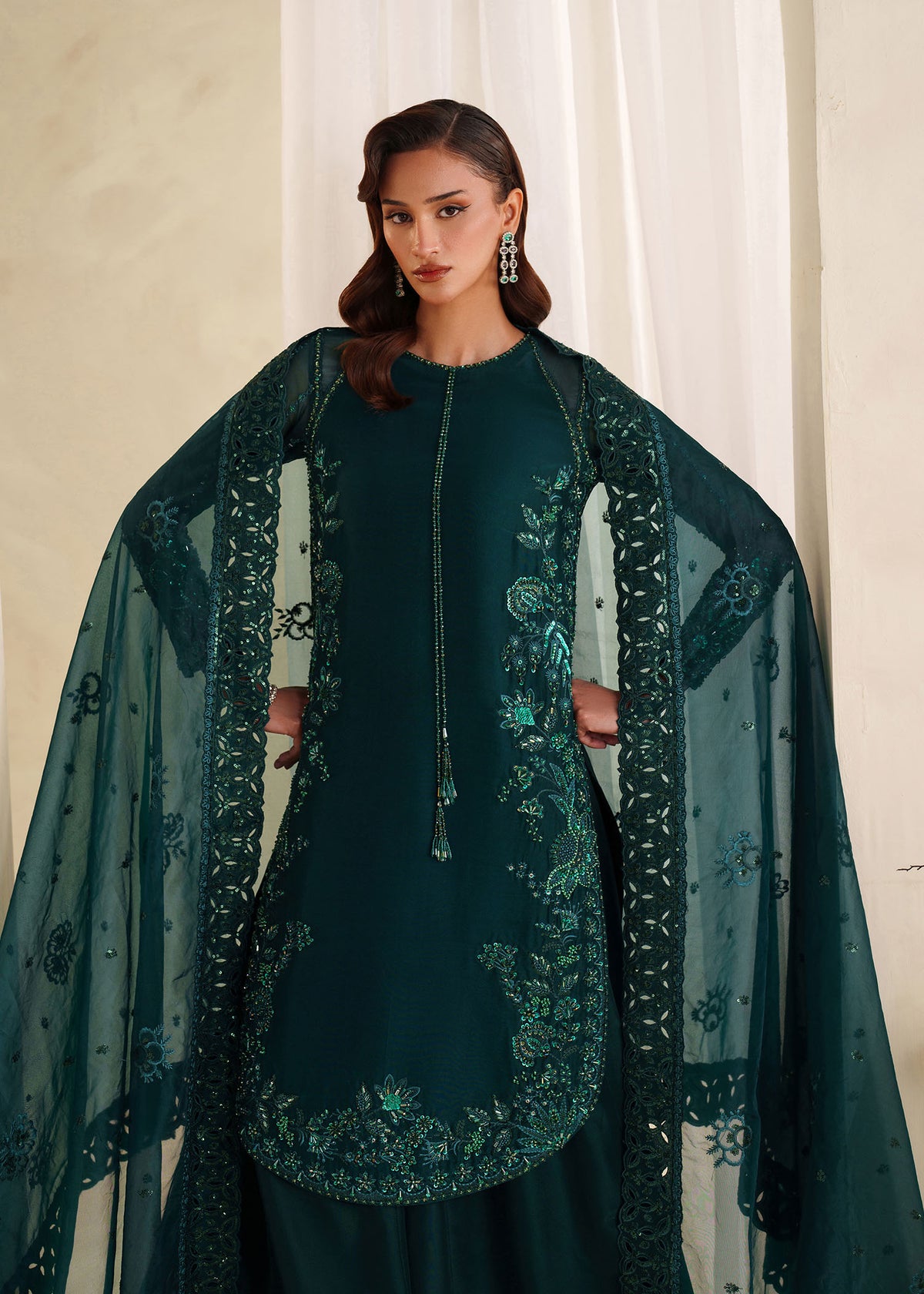Bold and regal, this bottle green creation is rendered in lustrous tissue silk. The tailored shirt with fully Embellished hanging Tussal and Sharara pants are paired with a Cutwork organza dupatta, making it a striking choice for evening celebrations and festive gatherings.