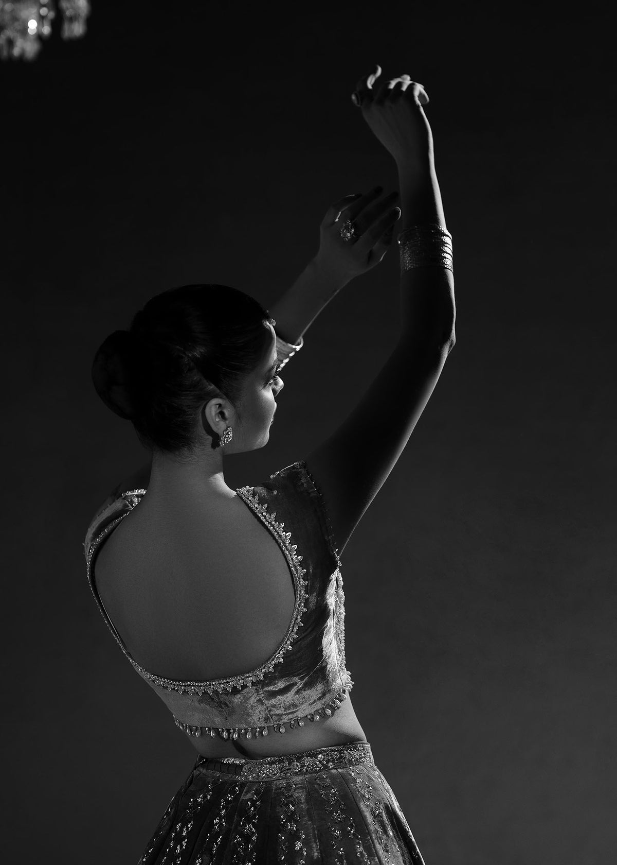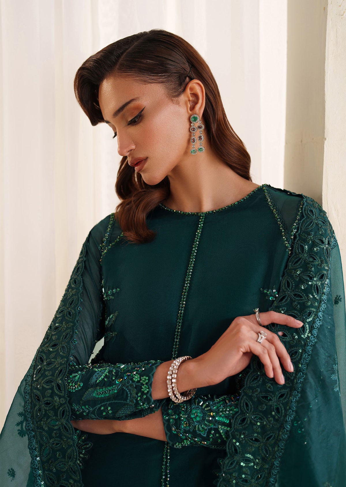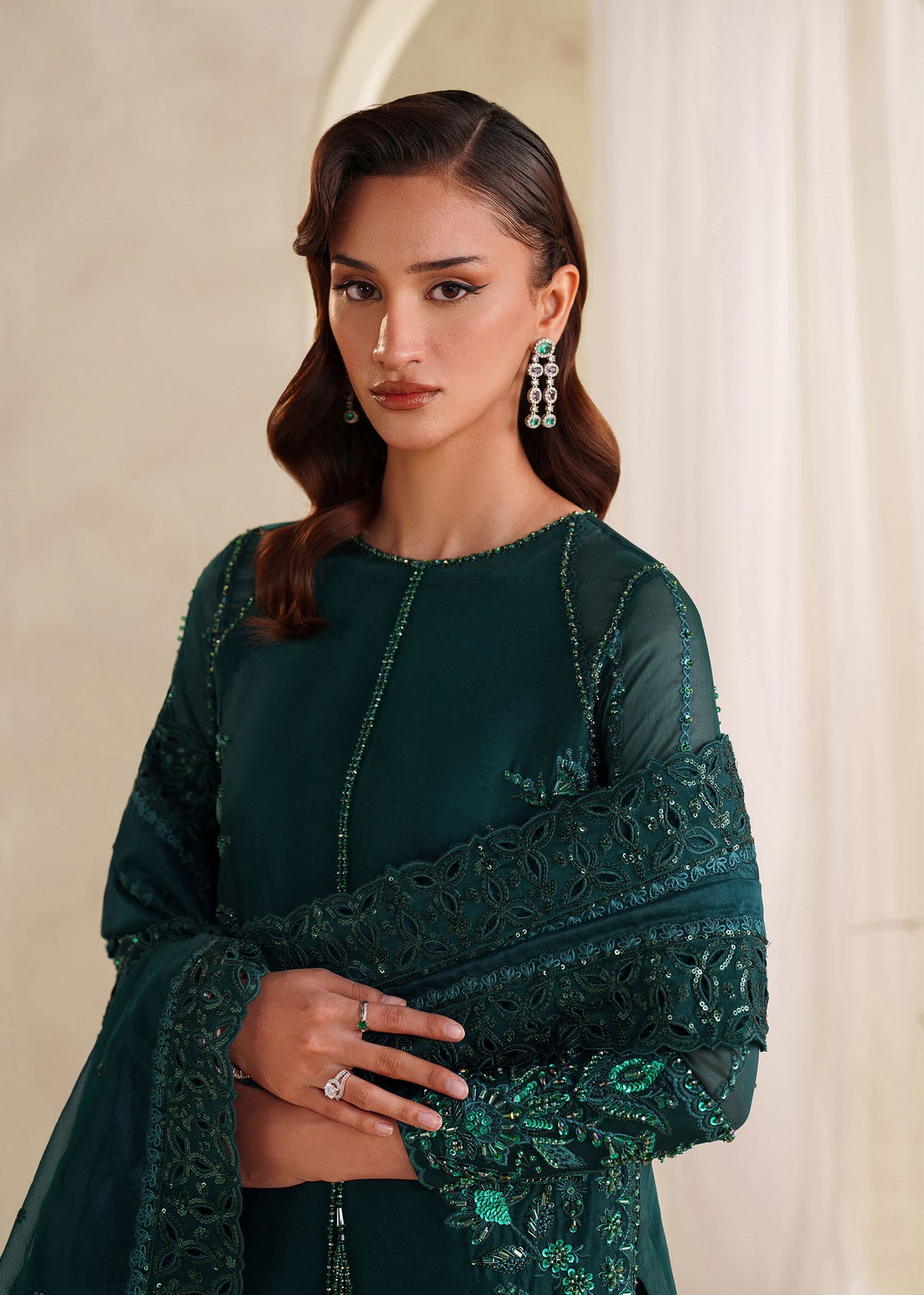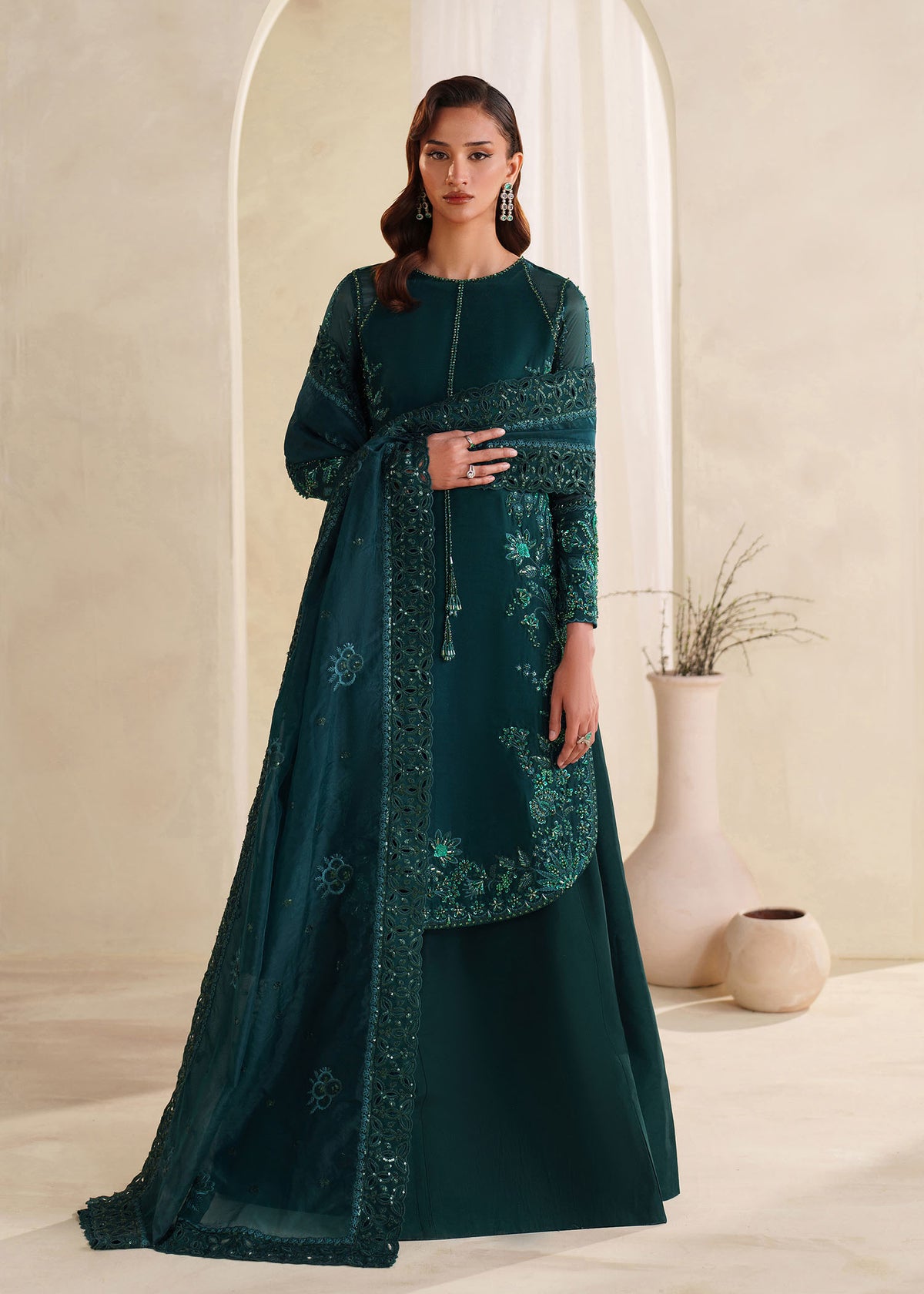 Bold and regal, this bottle green creation is rendered in lustrous tissue silk. The tailored shirt with fully Embellished hanging Tussal and Sharara pants are paired with a Cutwork organza dupatta, making it a striking choice for evening celebrations and festive gatherings.