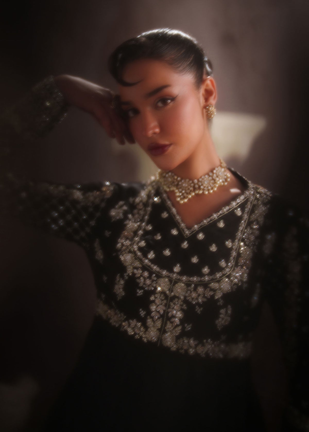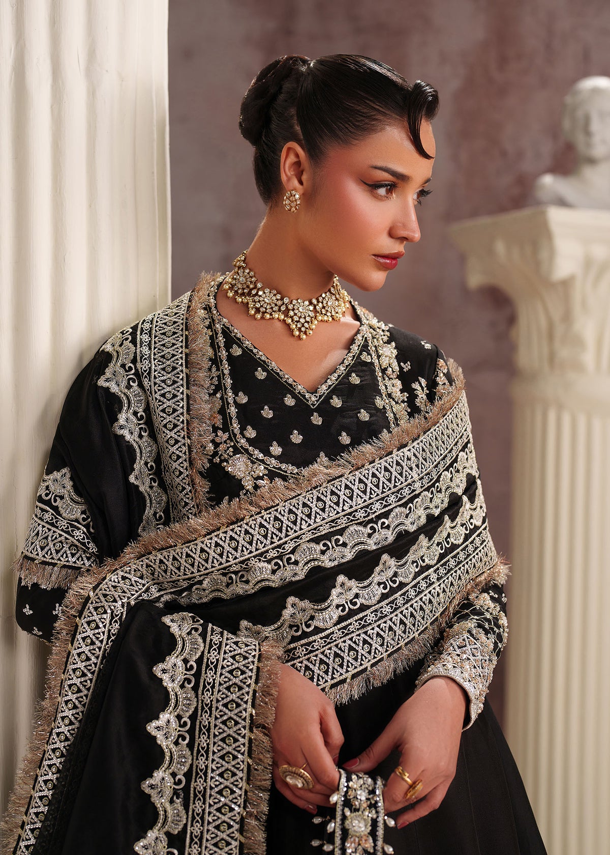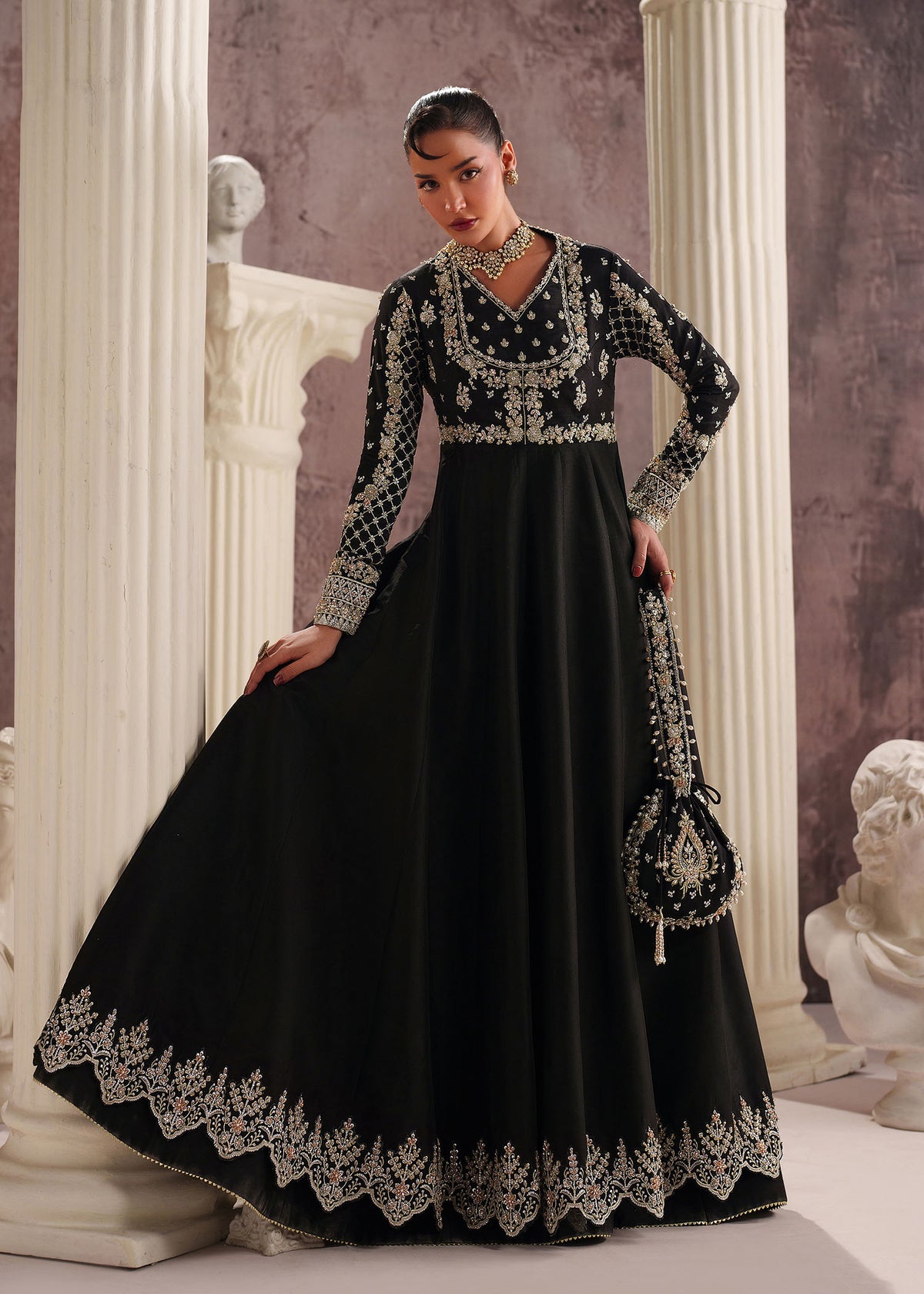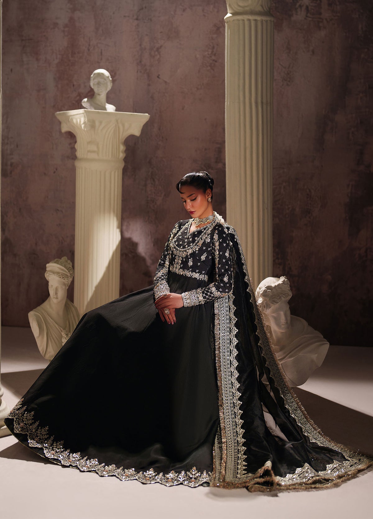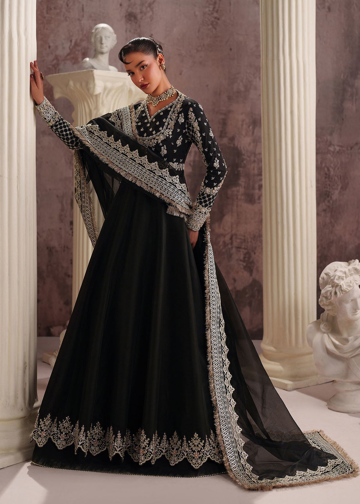 This stunning black ensemble features a tissue silk (korean) Pishwas and Pk Silk Lehnga, adorned with intricate embroidery and sequin beads,Saroski Stones ,crystal and paired with an elegant Organza Embroidered dupatta. Perfect for those who crave luxury and sophistication during the festive season!